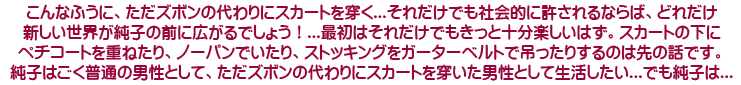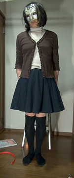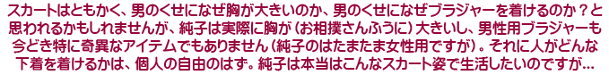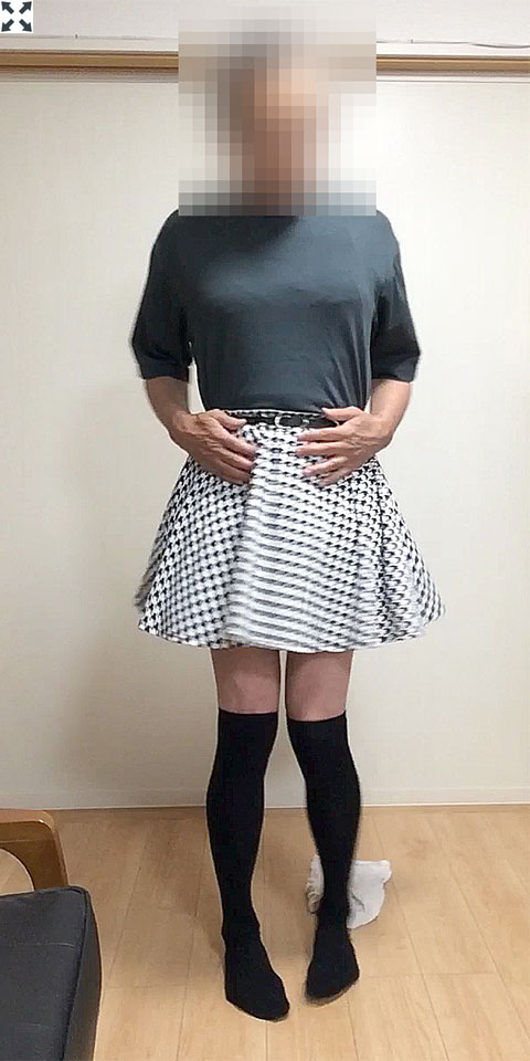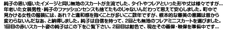 顔も頭も男モードでスカート姿に変身した純子です。上半身、下半身とも婦人物の下着を着けています...
