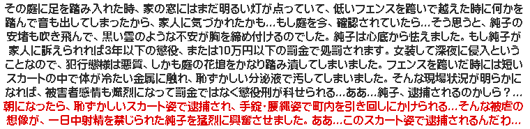 明らかに.この純子を...スカート姿の純子を...狙ってのこと。ライトに照らされる屈辱を避ける方途は、唯一つしかありません。純子は隣家敷地への不法侵入を決意しました...