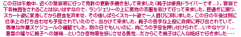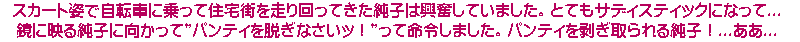 午前の警察署や午後の外出ではパンティは許されませんでした。でも、自転車に乗って外を回った夜はスカートの下にパンティを穿かされていました。