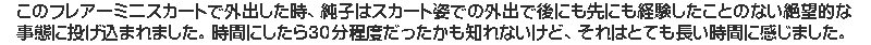 ここは純子がいつも行くショッピングセンター。ご近所の知り合いも多い所です。そんな目立つ場所に、こんな恥ずかしいフレアミニスカート姿で立たされて...待たされて...