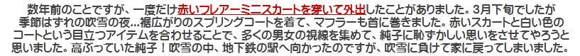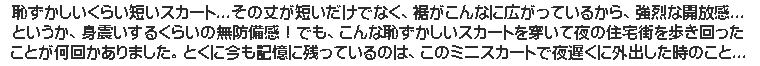 妻が突然決行する衣類の断捨離を夫が何とか宥め続けた結果、今もこのフレアーミニスカートは残っています。でも、今の純子のウエストにはとても入りません...