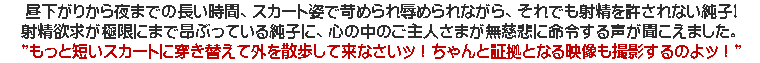射精欲求が限界まで昂ぶっていた純子...思い切り短いスカート姿で外出させて辱めてやるッ!...思い切り恥ずかしい思いをしたい...相反する情感が渦巻いて...