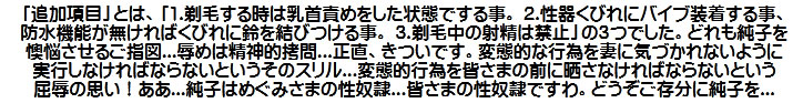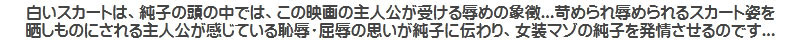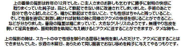 今回の<動画、この1篇!>には、妻の前にスカート姿で立たされ、性器に装着した淫具を弄ばれて強制射精させられた思い出の1篇を選びました...