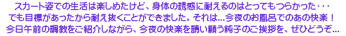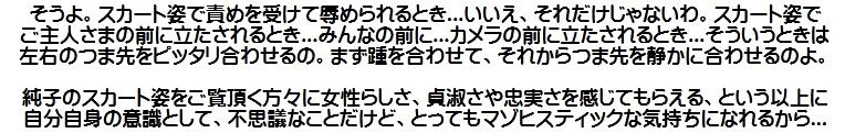 女性としての正しい動作を躾けられる純子...ああ...躾けられているんだわ...調教されているんだわ...って思うと、マゾの純子はスカートの中で身体がつらくなって・・・