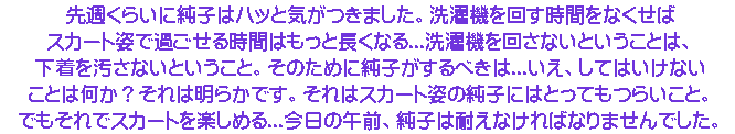 この日、純子はできるだけスカート姿でいたかったので、下着を汚さないよう過ごしたのですが・・・