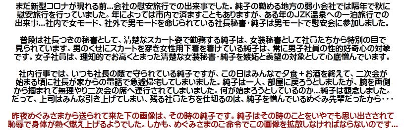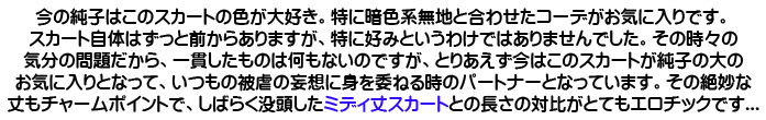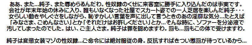 トップスをアウトで着るのは久しぶり...トップス・インの方がスカートを強調できるし、ウエストのくびれも...でも、この日はトップス・アウトで...それは純子の新しい苛め方のためでした...