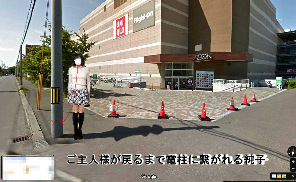 いつもは自転車で来るこのショッピングセンター...今日は罰としてこのスカート姿のまま町内引き回しの辱めを受けた末、ここに連行されて電柱に繋がれてしまいました...