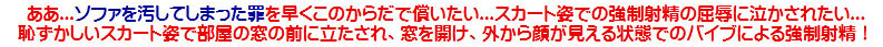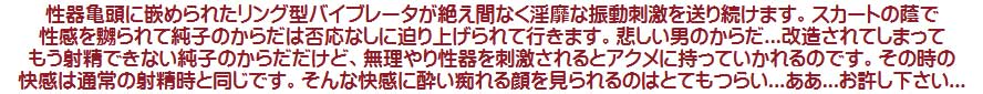 このバイブ、スカートの上でちょうど性器の先端に当たるのです!...射精の切なさに身体を捩ると、ちょうど性器にバイブが当たってとてもつらいの。ああ...もう許して...
