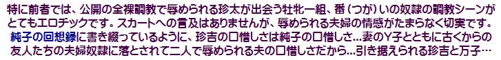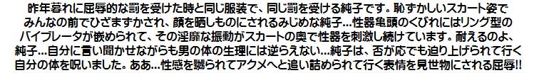 ええ、そうですわ。純子は今、ご主人さまから...めぐみさまから...厳しい罰を受けているのです。晒しものにされる辱め...それは、明日から始まる本格的著罰のプロローグ...