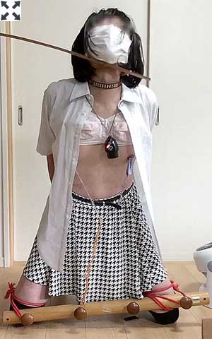 あの夜と同じ服装...スカートの中も同じです。赤いロープの股縄と白いレースの股割れパンティ...そして、手製の淫具でウシロを深々と犯されたまま、繋がれている純子...