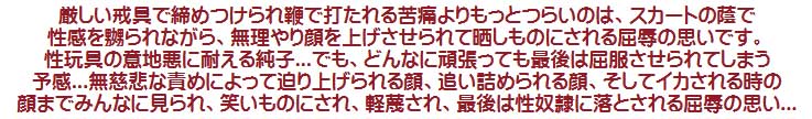 こんな短いスカートで!...みんなが見ている前でひざまずかされて公開懲罰にかけられる純子。乳首を責め具に噛まれる痛さ!...両脚を戒具で開かされたまま性感を嬲られる屈辱!...