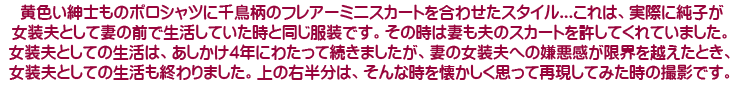 別ページにまとめておきました。ウィッグもつけずトップスは男物、下半身のみペチコートや下着・レッグウエアも含めて完全なスカート姿の女装夫です。