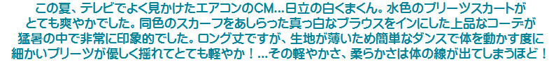 ピキジャバダンスに合わせて細かいプリーツが揺れ動くCM動画。最初に見た時から、水色のロングスカートに目を引きつけられてしまいました。