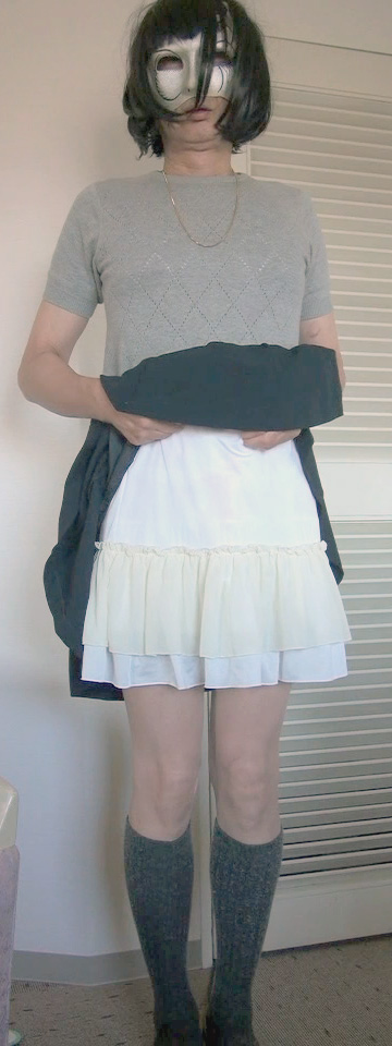 スカートの下には、これも新しく入手したペチコートを重ねています。でも、性器が剥き出しになっているのは前年と同じです...スカートを下から覗かれる恥ずかしさ...