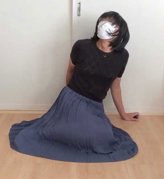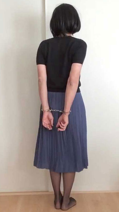 後ろ手錠をかけられたまま、低い台に座らされた純子です。ミニスカートだから、裾をつまんでスカート後ろに引かなくても、座ると自然とお尻が直に椅子に触れることに...