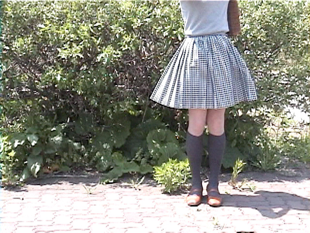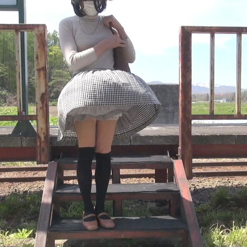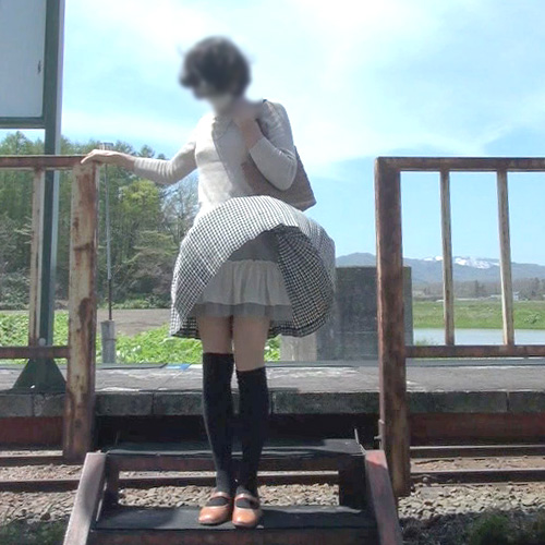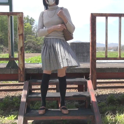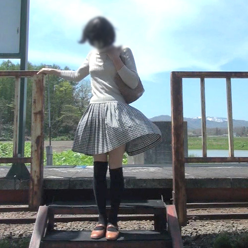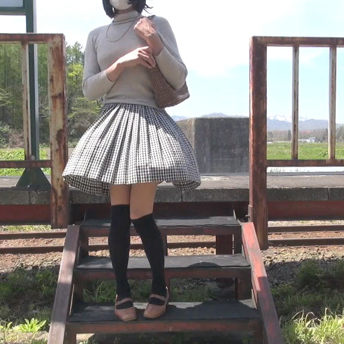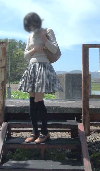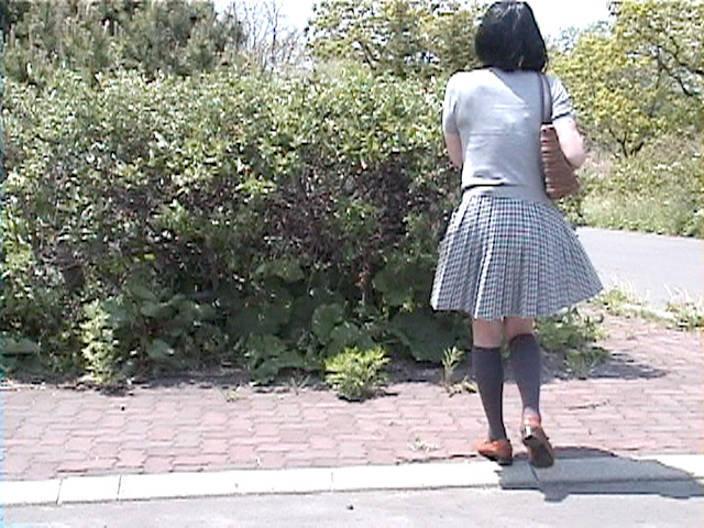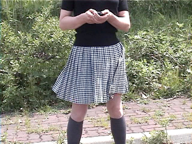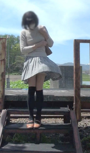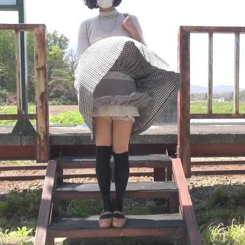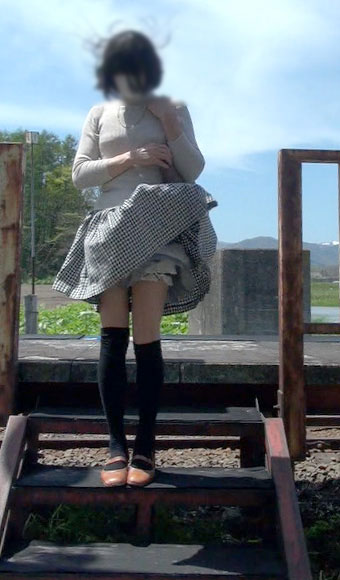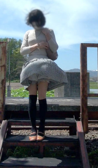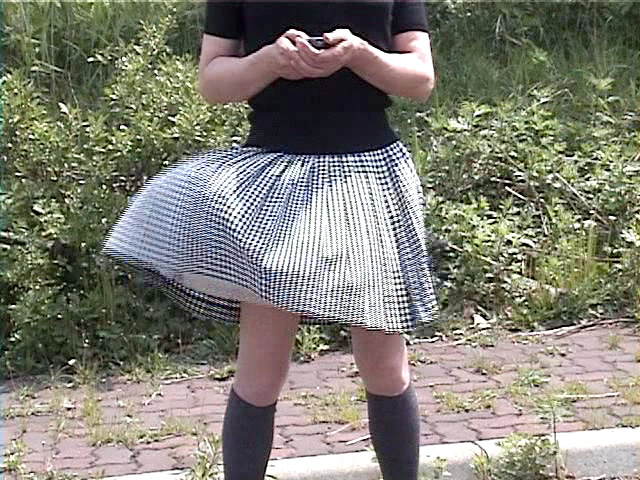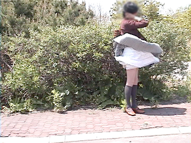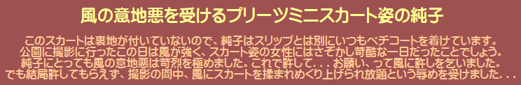 このプリーツミニスカート姿で風に辱められる純子の映像は