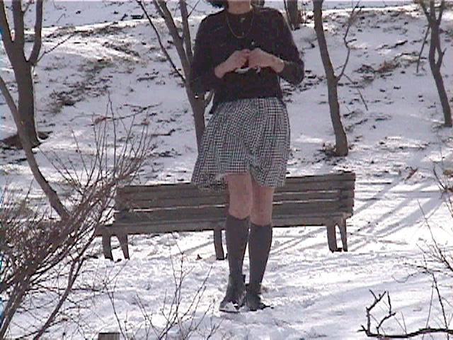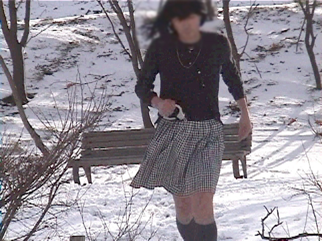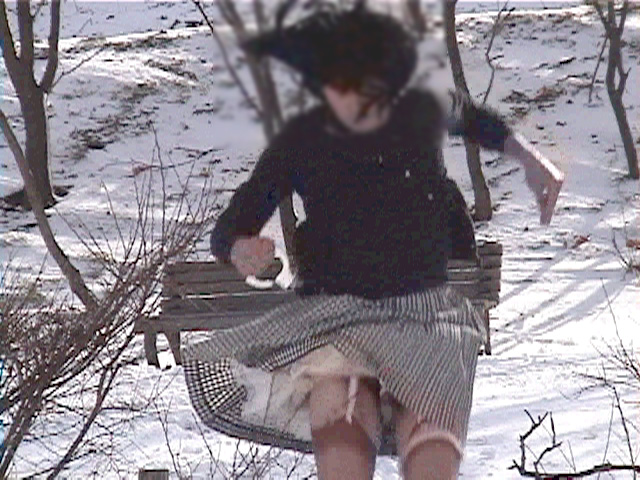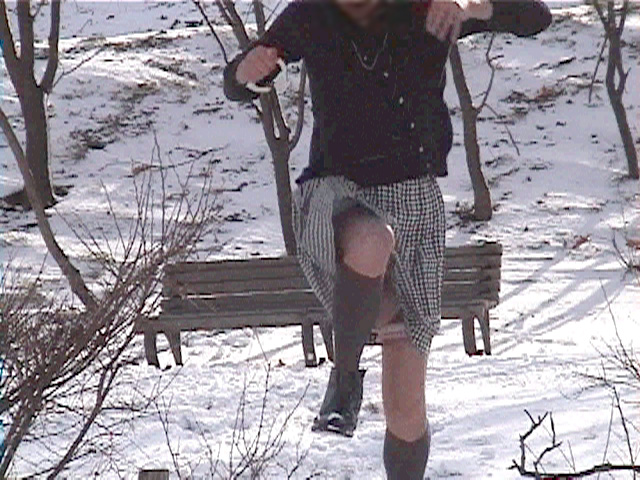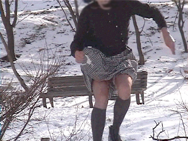 さらに斜面を下って生垣に向かいました。スカート姿だから逃げるのは大変...でも恥ずかしいなんて言ってられません。