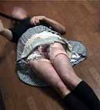 太ももの前を100回鞭打たれます。ストッキングの上から剥き出しになった肌を狙われて...