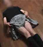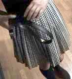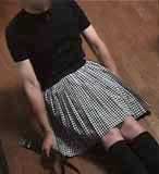 黒ギンガムチェックのプリーツミニスカートを捲り上げられて、お尻や太ももに鞭を受けます。