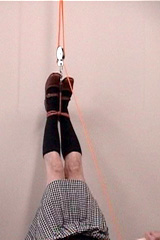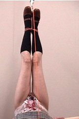 いよいよ拷問が始まりました。純子はスカート姿のまま逆さに吊るされます。 天井から垂れ下がるロープが滑車とギシギシ音を立てながら純子を吊るします。 足首が痛い...でも、それも拷問の一部なの...ああ...きついわ...痛い... こんな屈辱的な格好で固定され、しばらく放置されます。責めるなら一気に早く責めて... でも拷問は長引きます...責めはじわじわと純子を追い詰めます...ああ...屈辱的だわ...