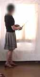 室内に差し込む午前の明るい光を浴びて、純子が膝丈スカート姿で明日のプレゼンの練習をしています。