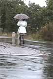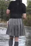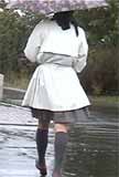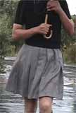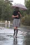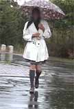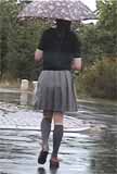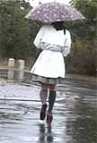 雨の中をスカート姿で歩きます。プリーツスカートの裾とハイソックスの上縁との間には、脚が外気に触れています。