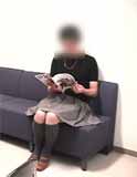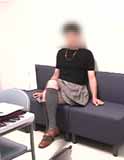 取引先の会社の応接室でプリーツミニスカート姿の純子が雑誌を見たりソファーに座ったりして寛いでいます。