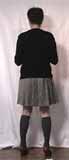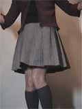 コートの裾からスカートがのぞいています。ストッキングはナチュラルで、グレー系のハイソックスを履いています。