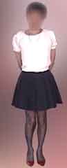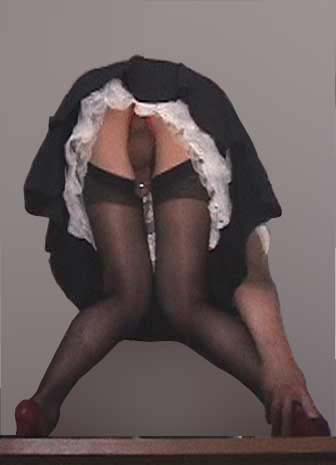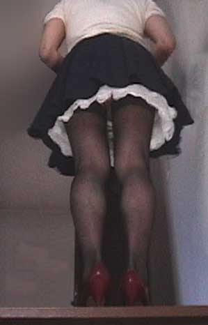 | 紺色無地のフレアーミニスカートを着けて階段で撮影しました。 このスカートは、私の(妻の?)グレー無地のフレアーミニと 同じ長さなんですけど、履き心地としてはこの方がより短いの。 この撮影の時には、メード用ペチコートを着けています。 いつものペチより生地が硬くて、何層かの複雑な構造です。 スカートの形を整えるにはうってつけね。 |