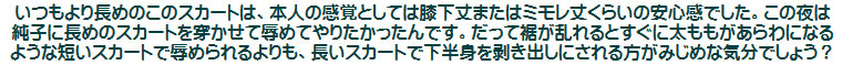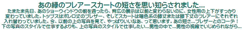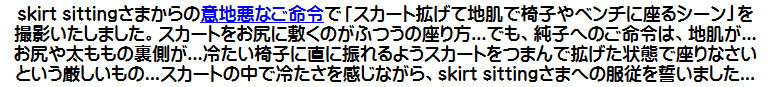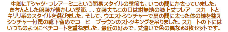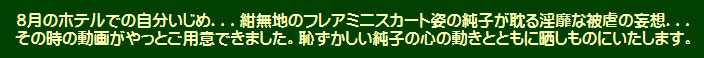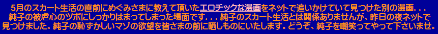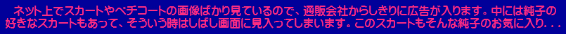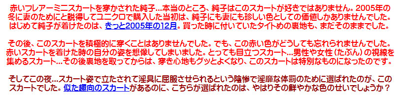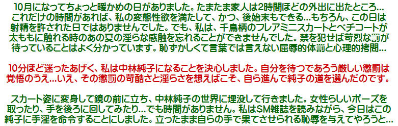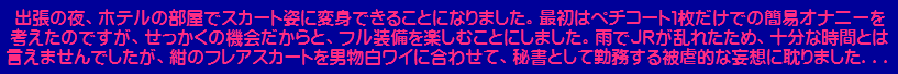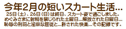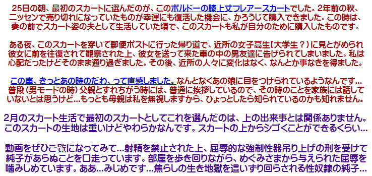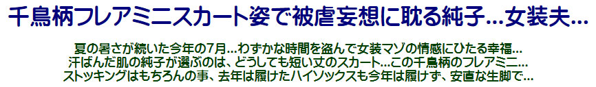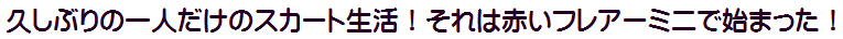 今までで一番長かった足掛け3ヶ月のスカート生活では、千鳥柄のフレアーミニスカートが基本でした。紺無地フレアーミニスカートでは人混みの中へも入って行きました...