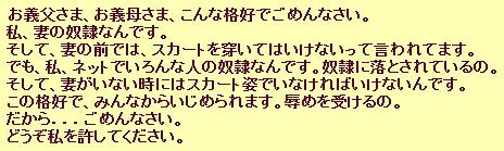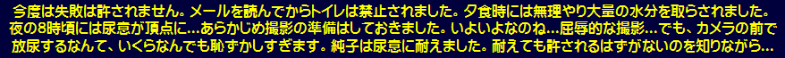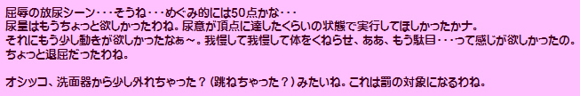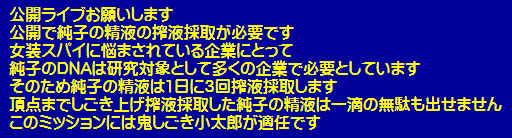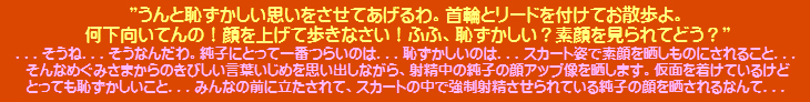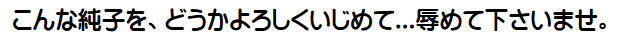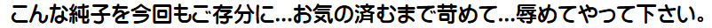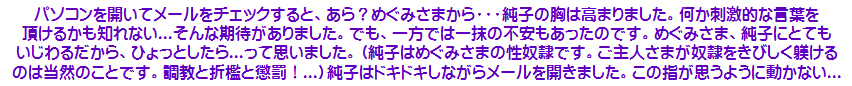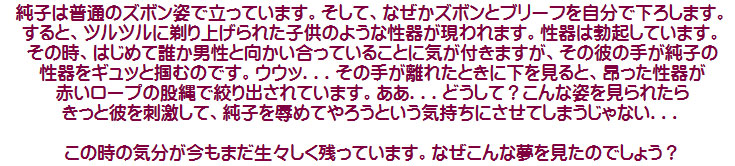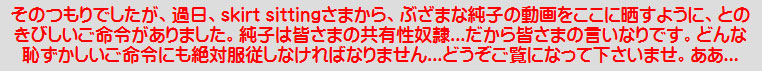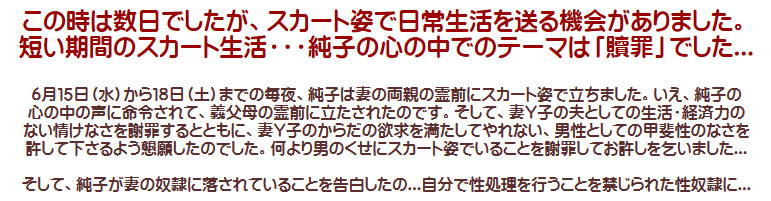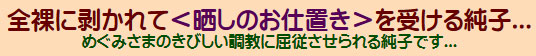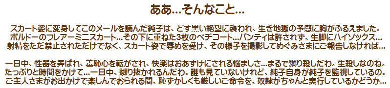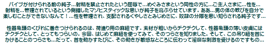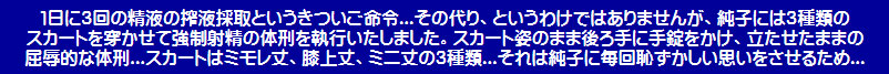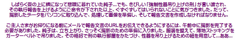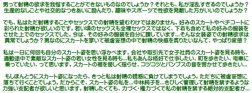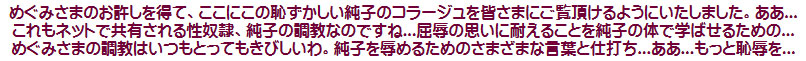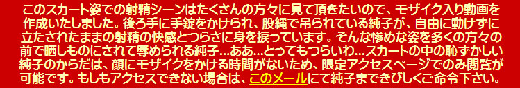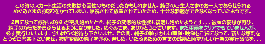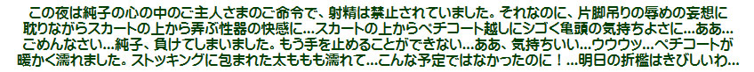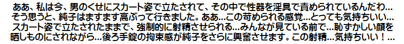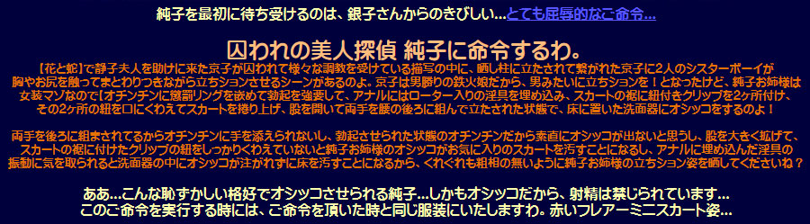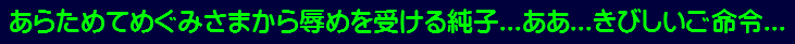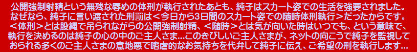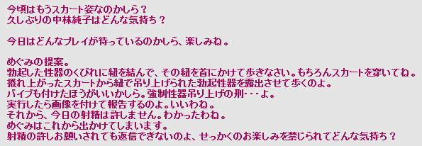| 純子自身による純子の射精管理権を自らの意志で放棄し、これをめぐみさまに謹呈。今後の純子の射精はめぐみさまのご許可によってのみ可能となる... |