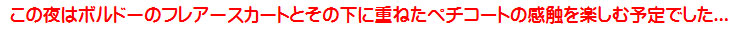 | 下半身はペチコート40cm丈黒2段ギャザー)のみ、パンティを許可して就寝。 |