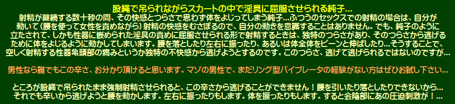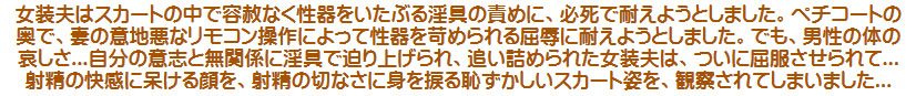 連続射精のため大幅な性欲減退→スカート着用意欲喪失。 射精不能! |
