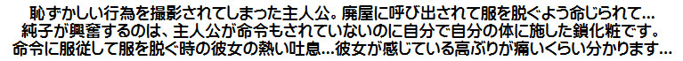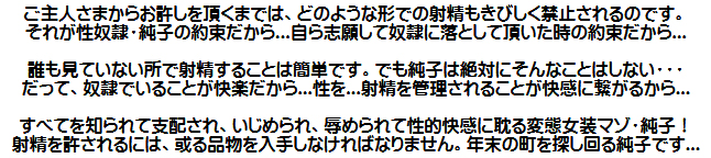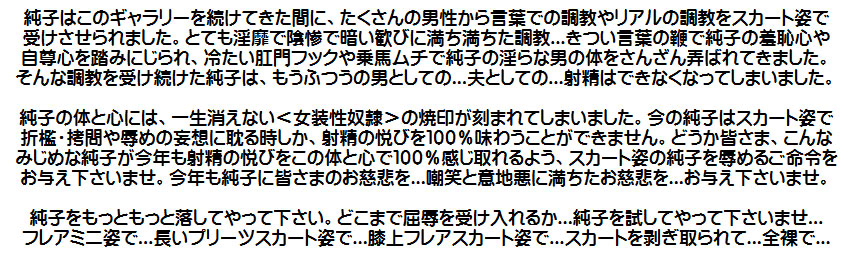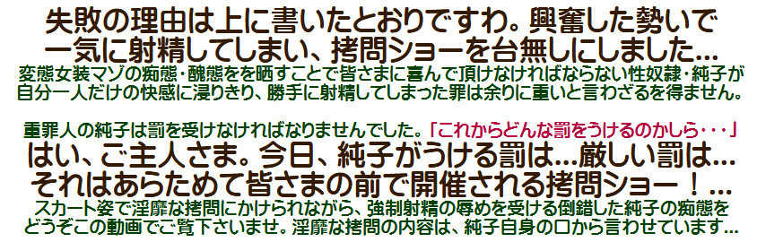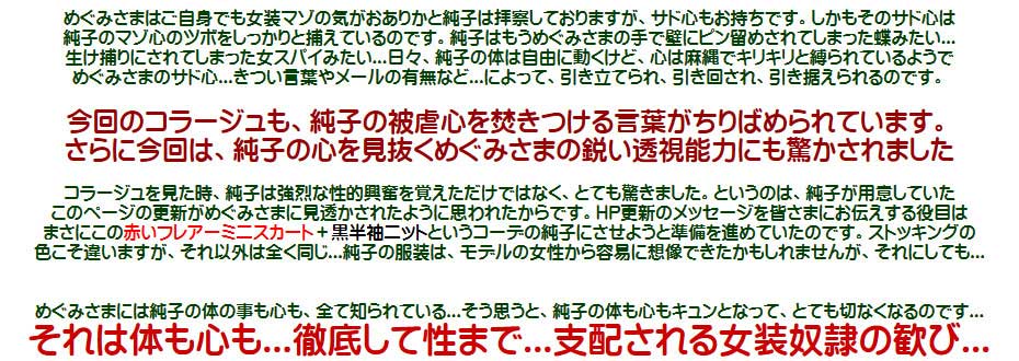 純子は女装の変態マゾ奴隷として、ご主人さまに一生服従いたします。ご命令に背いた時にはどうぞ厳しいお仕置きで純子を辱めて・・・
