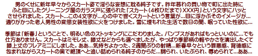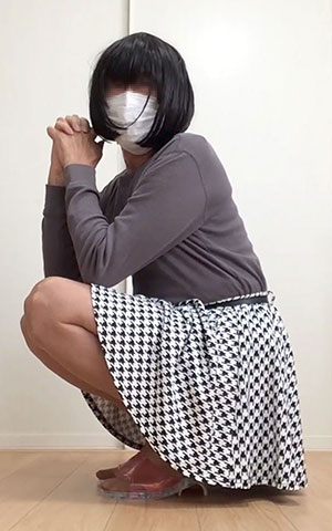 妻が短時間の外出をする時はいつでもスカート姿に変身します。中林純子として被虐の妄想に耽りながら自分虐めに没頭し、射精の快感に