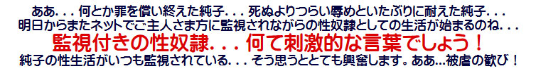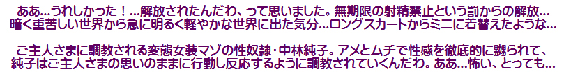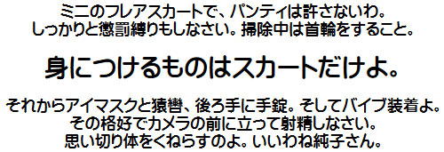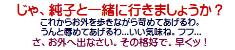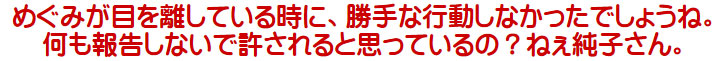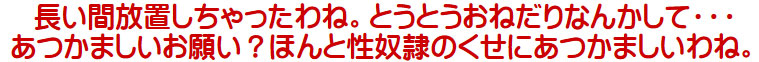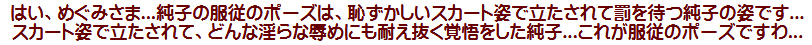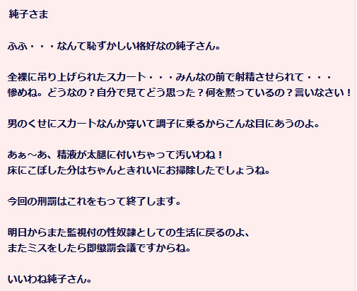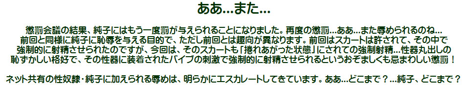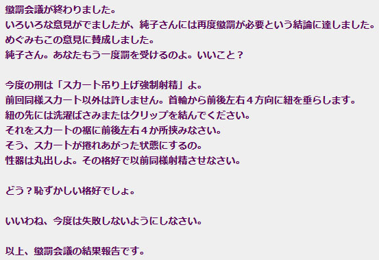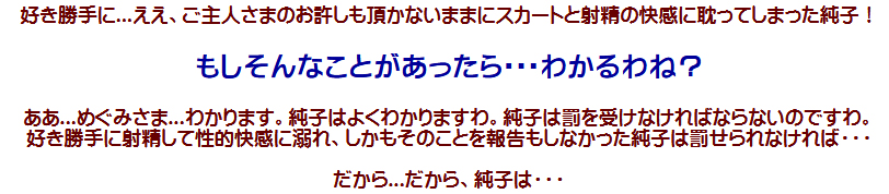 詳しく説明しなければなりません。もしめぐみさまが戻ってきた時にまだ居たら、おぞましい懲罰が純子に与えられます。ああ...どの道、純子を待つのは辱めの生き地獄ね...