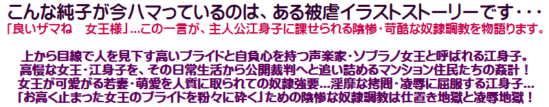 萌愛はご主人が海外赴任中の若妻。このイラスト物語は、意地悪で嗜虐的な主婦たちによって萌愛を人質に取られた女王が奴隷に落とされて行く過程を描きます。