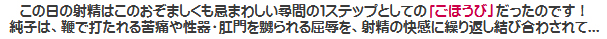 この時の射精は特につらかったわ。亀頭のくびれを麻紐で括られて、吊り上げられていたから...