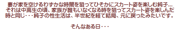 虫のいい話であることは夫の私もよく分かっていたので、妻の言う通りにしました。その結果は元の純子...妻の目を盗んで愉しむスカート女装です...