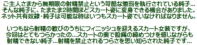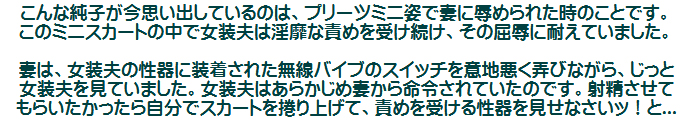 今回の<動画、この1篇!>には、妻の前にスカート姿で立たされ、性器に装着した淫具を弄ばれて強制射精させられた思い出の1篇を選びました...