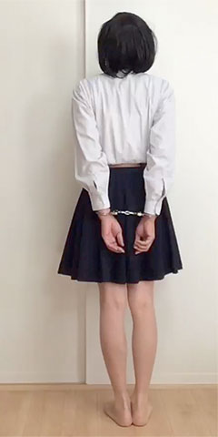 両手首には背中で冷たい手錠がかけられています。座ることも許されず、スカートの奥では性器亀頭部に嵌められた淫具が純子をいじめています。耐えるのよ、純子!