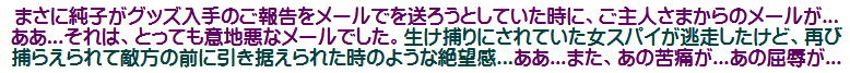 感じられるからです。じりじりと奴隷に落とされて行く女王の恥辱は、純子が鬼しごきさまから受けた陰惨・淫靡なメール調教の恥辱を生々しく思い出させるのです。