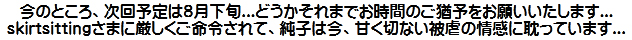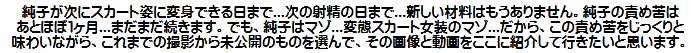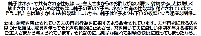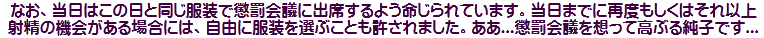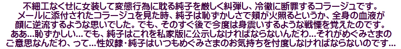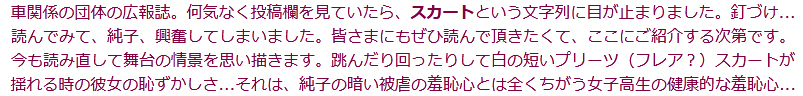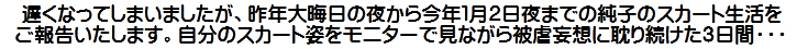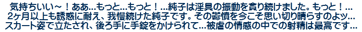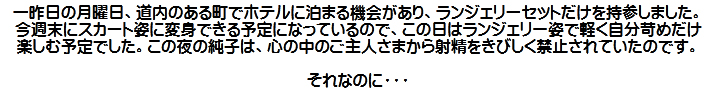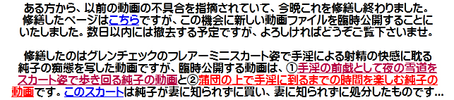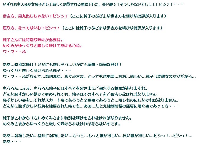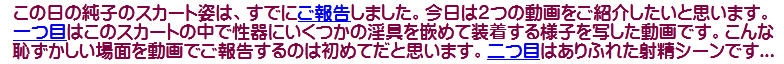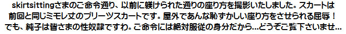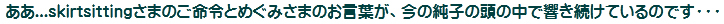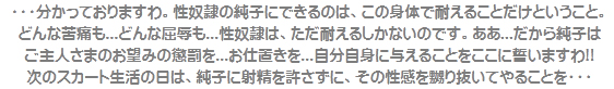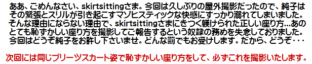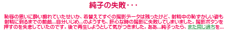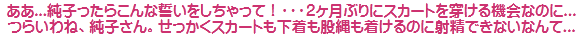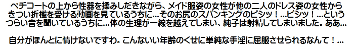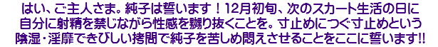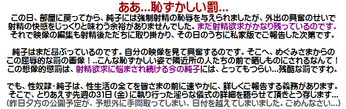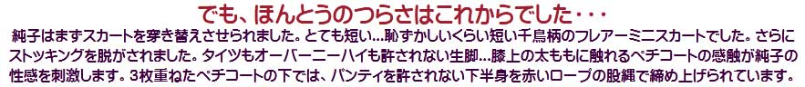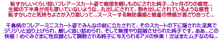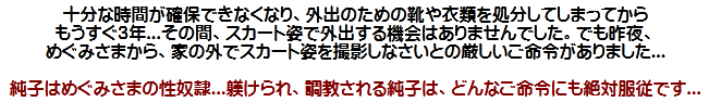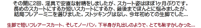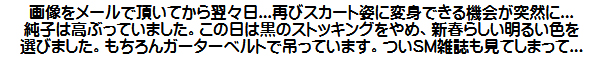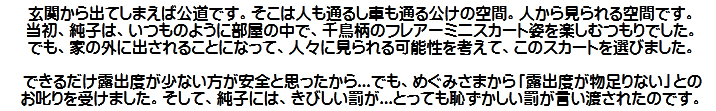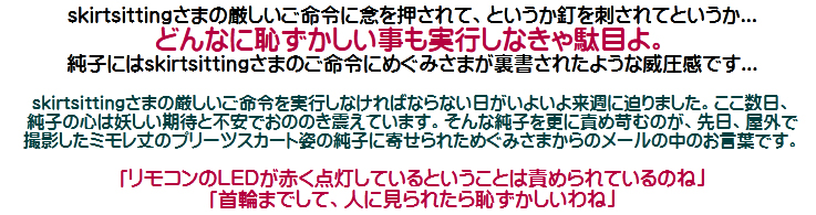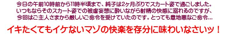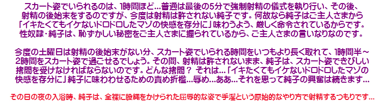 [皆さま。ご主人さま。純子がスカート姿を楽しんだあとで簡単な射精をすることだけはどうぞお許し下さいませ...]