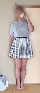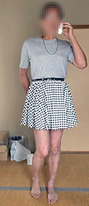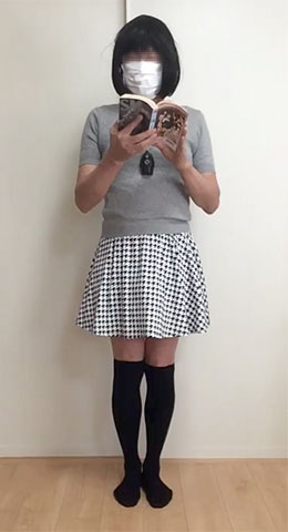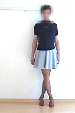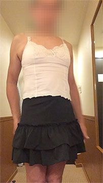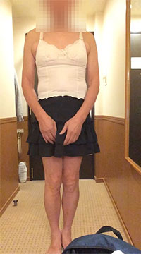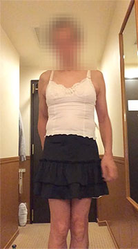 別ページにまとめておきました。ウィッグもつけずトップスは男物、下半身のみペチコートや下着・レッグウエアも含めて完全なスカート姿の女装夫です。