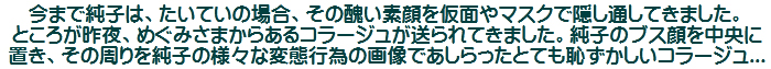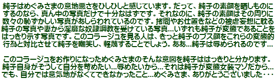 「ほら、見てご覧なさい、純子さん。これがあなたよ。恥ずかしいわね、不細工な男がこんなこと...」って。
