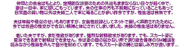 2015年暮れ〜2017年秋の妻の前でのスカート生活については、妻の性奴隷としての生活のほか、スカート姿での家事奴隷としての生活も合わせて