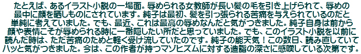 SM雑誌を読みながら、厳しい拷問で辱められる主人公の気持ちを思う純子...