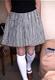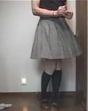ヘリンボンの幅広プリーツミニか、無地の青灰色のフレアーミニスカートを考えています。ハイソックスも2通り。