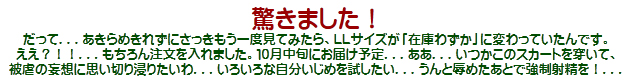 このフレアースカートは持参して、ほんとに穿けないかどうか、kaorinさまに検査して頂きます。そして穿けない場合はこれ...