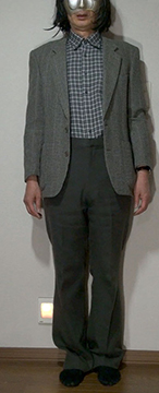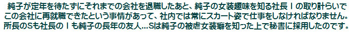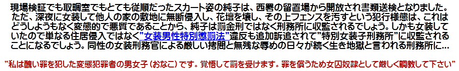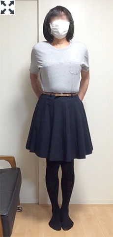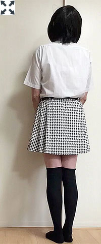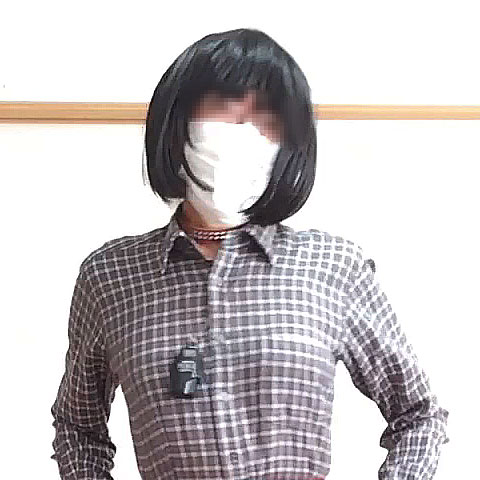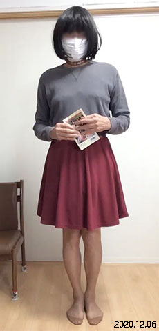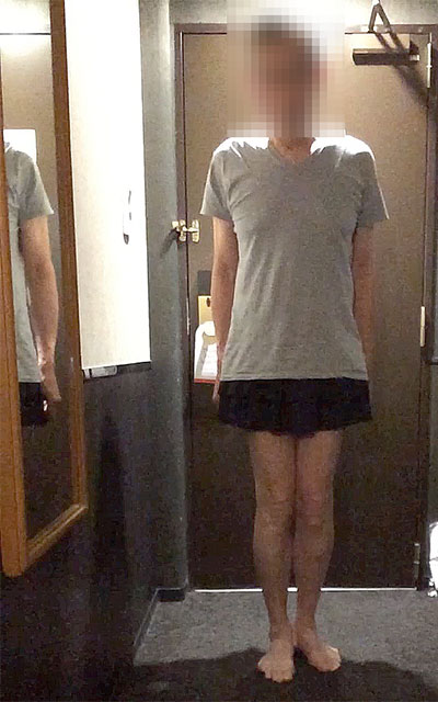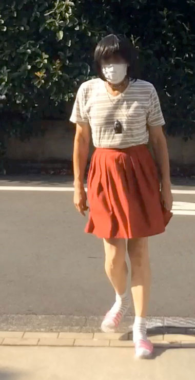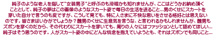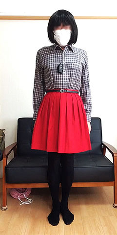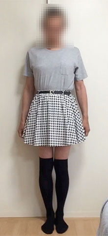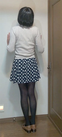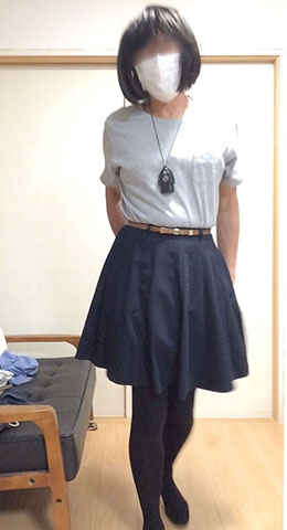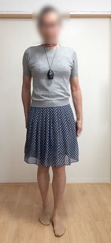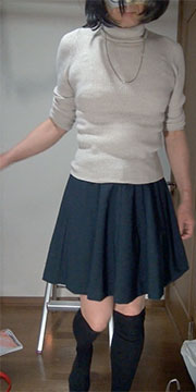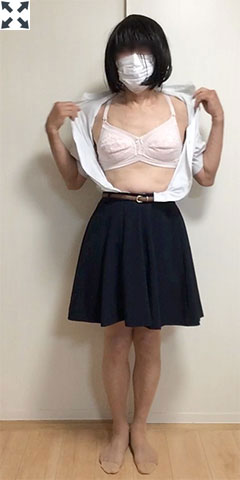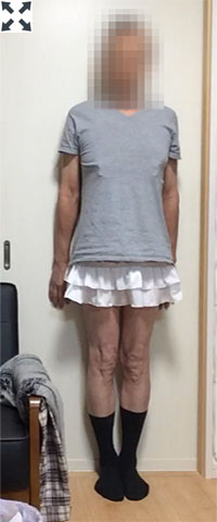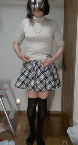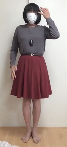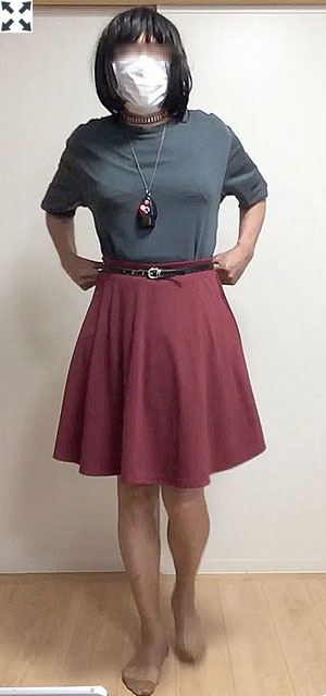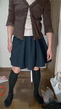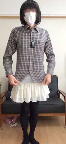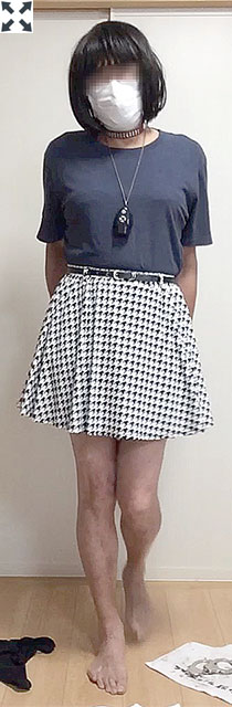 顔も頭も男モードでスカート姿に変身した純子です。上半身、下半身とも婦人物の下着を着けています...
